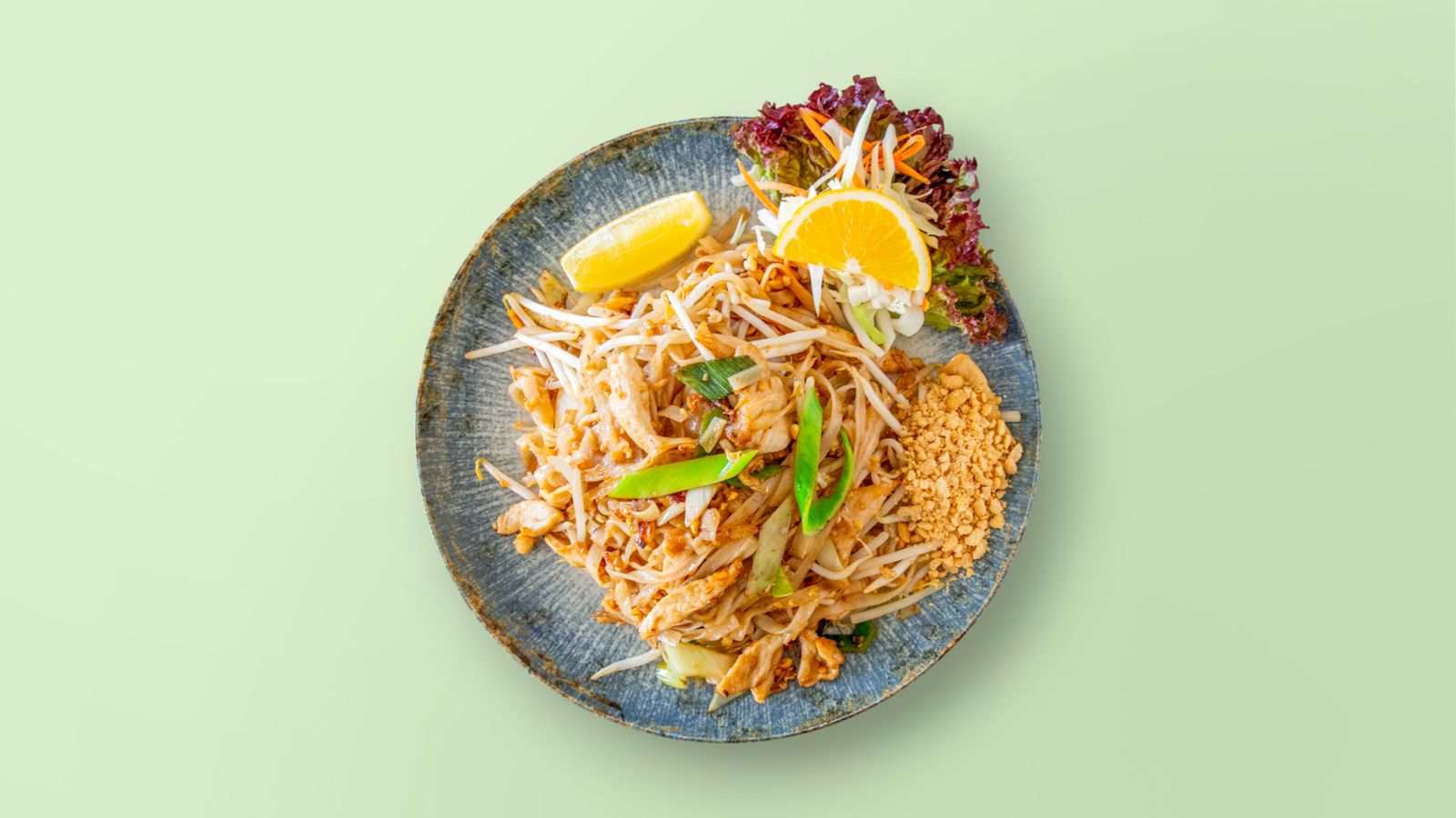 genratene Reisnudeln mit Sojasprossen, Ei, Karotten, Erdnüsse und einer Fleischsorte nach Wahl